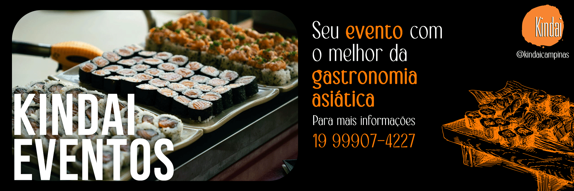 É o nosso serviço de buffet para eventos. Levamos toda a qualidade e sofisticação do Kindai para o seu evento externo. Entre em contato conosco para detalhes e disponibilidade. Para informações e orçamentos, entre em contato através 19 99907-4227.